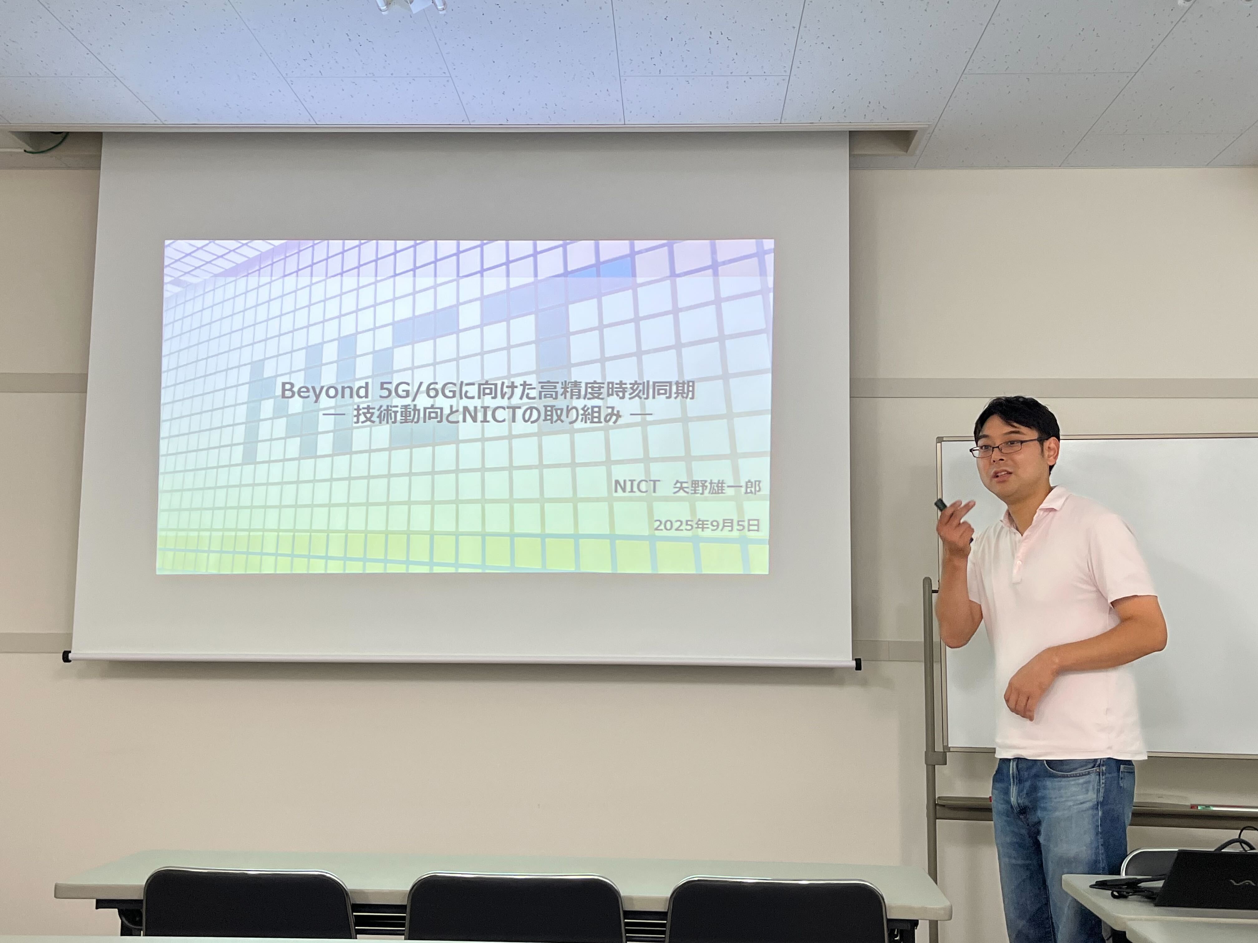 本講演では、NICT主任研究員を務める矢野雄一郎氏が「Beyond 5G/6Gに向けた高精度時刻同期 ― 技術動向とNICTの取り組み ―」と題して講演を行った。